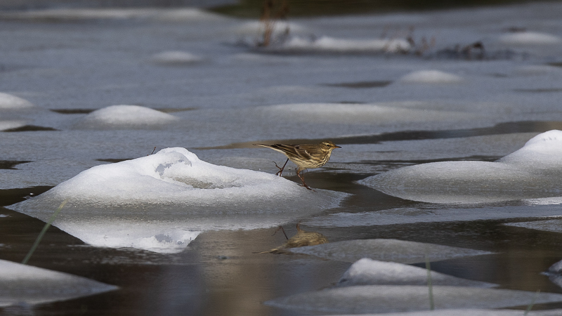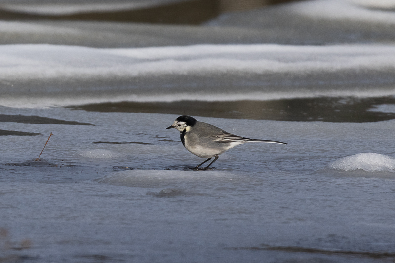 Sur le retour, je fais encore un petit détour à la Krümmi. Les champs sont blancs et les oiseaux y sont rares. Mais au détour d'un chemin, un champ commence à être inondé dû à la température qui se situe aux alentours des 10 degrés ce qui fait fondre la neige. C'est dans ce champ que les oiseaux se sont donnés rendez-vous. J'ai pu y observer une cinquantaine de Goélands leucophée, trente Mouettes rieuses, deux Vanneaux huppés, trois Hérons cendrés, quelques Pigeons ramiers, quinze Bergeronnettes grises, dix Alouettes des champs et huit Pipits spioncelle. Un peu plus loin, le long d'un des canaux du Seeland, j'ai pu encore observer un Chevalier culblanc et trois Bécassines des marais.