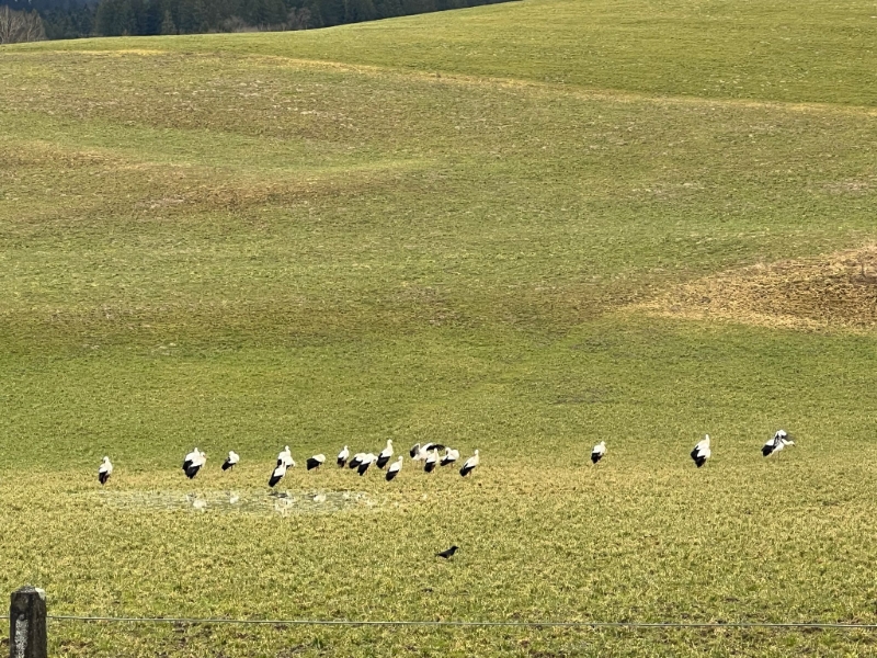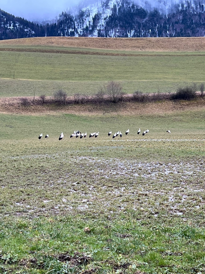 En passant par la route principale entre Tavannes et Reconvilier, pas loin de la Coop, j’aperçois de loin des grandes taches blanches dans les champs partiellement inondés à cet endroit, et en y regardant de plus près, je remarque avec étonnement et émerveillement qu’il s’agit d’un grand groupe de cigognes blanches en train de se ravitailler pendant leur migration, risquant de prendre froid, je reste à les observer pendant une heure environ. Après s’être baladées dans les champs pour se nourrir, les voila qui se rassemblent lentement, font soigneusement leur toilette avant de s’envoler contre un fort vent, se laissant ensuite emporter dans un carrousel géant et spectaculaire en direction du nord, je les crois parties définitivement vers leurs contrées de prédilection, mais quelle surprise, le lendemain le même groupe de 22 cigognes était à nouveau présent au même endroit avant de s’envoler cette fois définitivement, ce groupe de cigognes était accompagné d’une mouette rieuse certainement égarée. Autre oiseaux observés ce jour-là au même endroit : Pies, corneilles, merles, grives, faucon crécerelle et pigeons biset domestiques. Bref, un matin plein de magie.