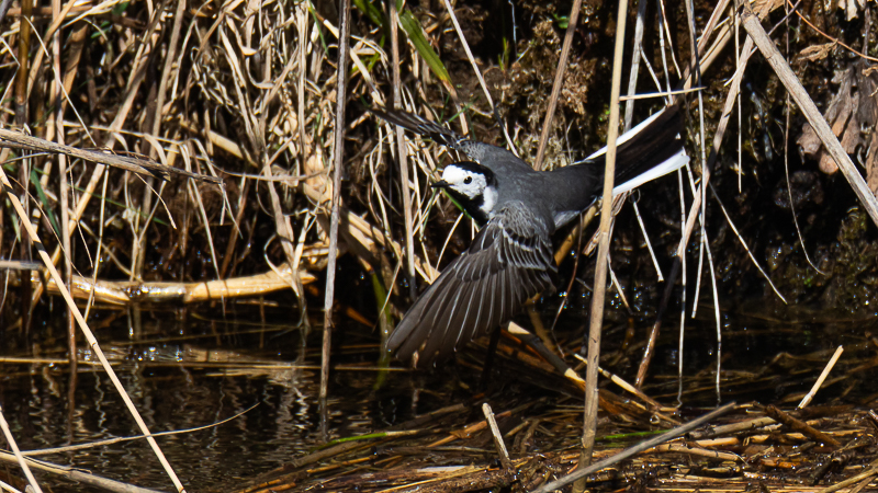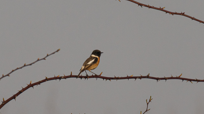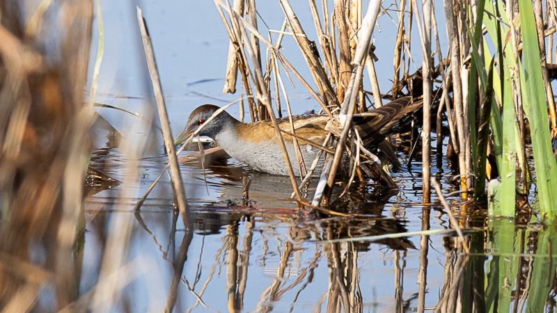 Des roselières montent de nombreux cris, dont ceux des invisibles Panures et entre-aperçus Râles. Acoustiquement discrète mais toujours bien en vue sur les buissons dépassant des roseaux, la Pie-grièche grise affûte. Un Épervier en fait de même, quelques mètres plus haut, depuis les arbres bordant le canal.