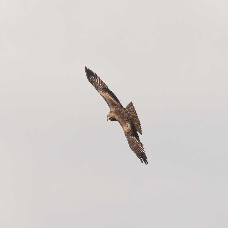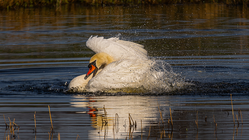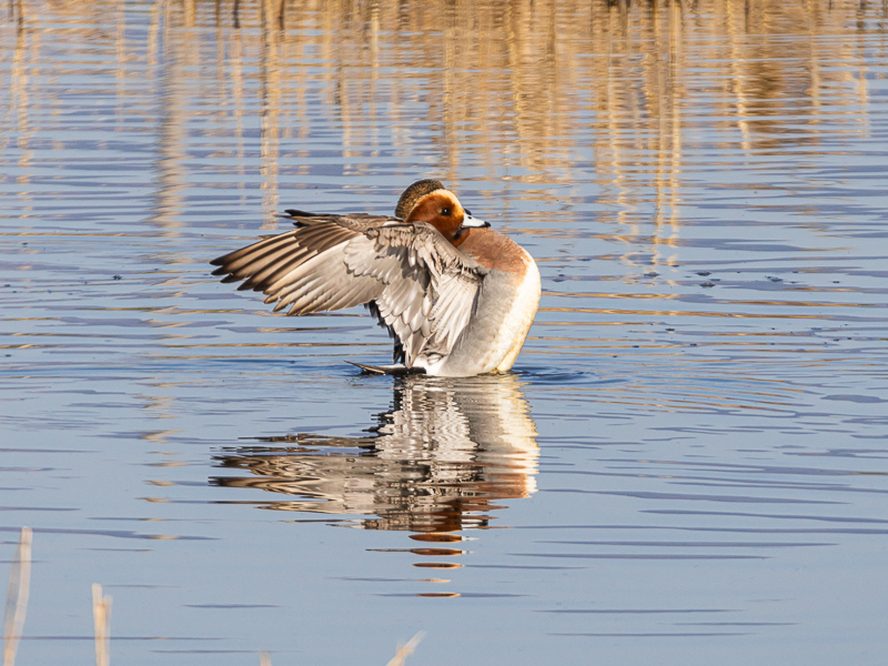 Un busard au torse moucheté passe (trop vite) ; quatre silencieuses Grues cendrées repérées tardivement disparaissent derrière les roseaux au loin, à l'instar du soleil. Fin de journée.