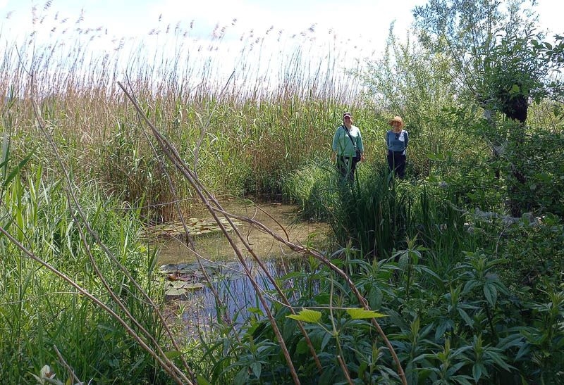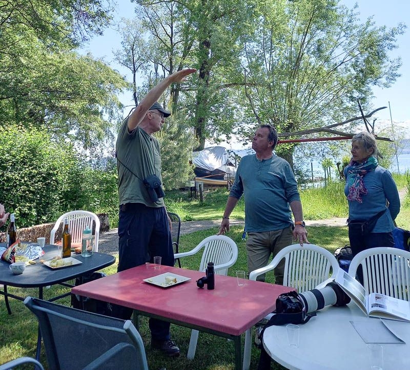 Notre guide du jour nous accueille ensuite dans son petit paradis pour une pause très conviviale, entre apéro, pic-nic, grillade, café. Les jumelles ne sont jamais loin. Un Gobe-mouche noir peut être entendu et observé sur place, tout comme les grenouilles de l’étang et les oiseaux d’eau au large.