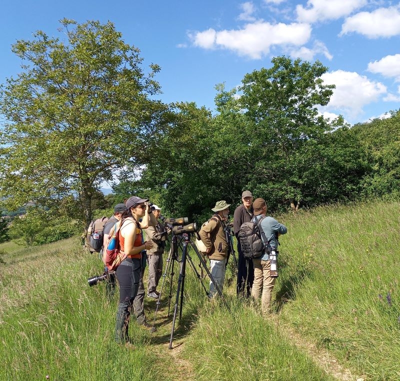 Pour notre plus grand bonheur la Huppe, attendue, espérée, rêvée, s’est manifestée très rapidement. Depuis quelques années, elle niche dans la région en profitant des trous dans les murs de pierre sèche des vignes, voire des cimetières. Un trou percé au bas d’une capite fait parfois l’affaire. Les nids occupés sont protégés par des interdictions de passage. Son chant nous accompagnera tout au long de la balade et ses allers-retours orangés provoqueront des arrêts réguliers. Hirondelles, Martinets, Buses et Milans nous survolent. Parmi les rapaces, le passage d’une Bondrée apivore a été une belle surprise