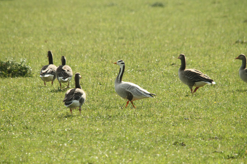 Dimanche matin calme au niveau des baigneurs et des grillades du côté de Hagneck, mais au niveau ornitho c'était intéressant. Il y avait des rougequeues noirs et mésanges charbonnières en plein nourrissage des jeunes, un gobemouche noir, 22 oies cendrées dans les champs et dans ce groupe, une oie de couleur plus claire m'intrigua. C'était une oie à tête barrée. Iil y en avait encore 2 oies cendrées sur l'île de gravier avec 3 jeunes (déjà en 2010 il y avait eu une nichée), 1 coucou gris, hirondelles rustiques et de fenêtre, des martinets noirs. Point de vue limicoles, pas grand chose à part un chevalier sylvain.