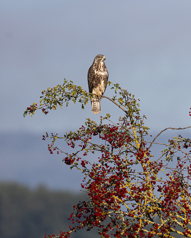 En ce même lieu séjournaient le Traquet motteux et le Faucon crécerelle. En lisière de forêt était perché un rapace pâle, strié dessous, brun foncé dessus avec une zone plus pâle sur les couvertures moyennes. Manifestement il s’agissait d’une jeune Buse variable.