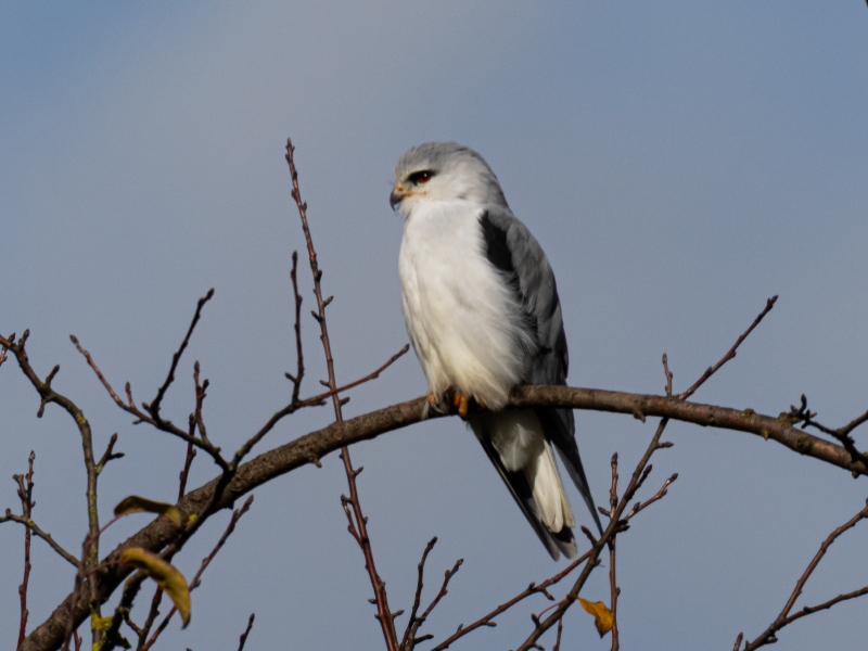 Après une matinée à chercher cette rareté et ne la trouvant pas, je décide d'abandonner en pensant qu'elle avait poursuivi son chemin migratoire. Et au détour d'une haie, j'aperçois un point blanc au sommet d'un arbuste, je prends mes jumelles pour voir ce que c'était et oui c'était bien lui, un magnifique Elanion blanc, petit rapace de la grandeur d'un Faucon crécerelle et nicheur en Europe du côté de la péninsule ibérique.