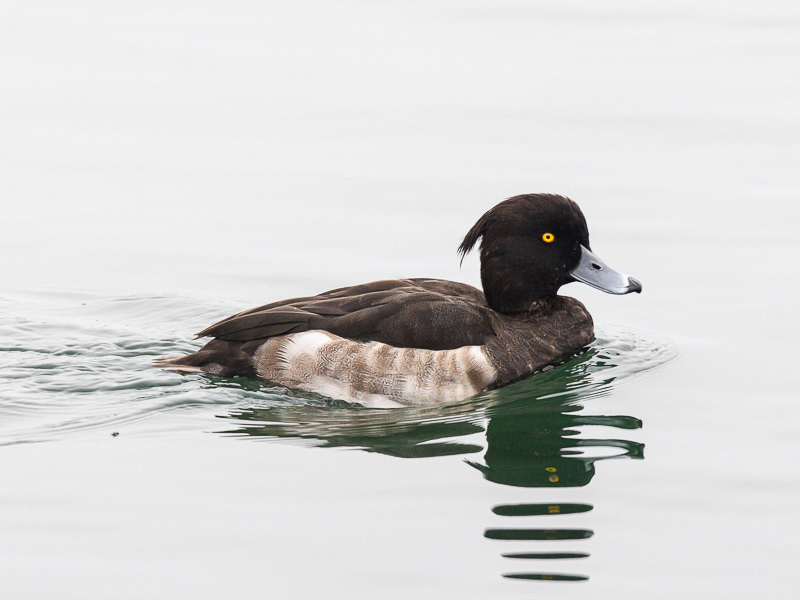 Tous ces canards s’activent et de plus on peut facilement confondre un Fuligule morillon avec un Fuligule à tête noir. Vu la difficulté de la tâche, prenons notre temps et surtout les volatiles, l’un après l’autre. Et la méthode paie. Après une vingtaine de minutes, je le « tiens » dans ma longue vue. Contrairement aux morillons mâles qui ont uniformément le dos noir et les flancs blancs, celui que je viens de « fixer » possède des flancs blancs légèrement striés et le dos gris bien hachuré. Aythya affinis est là ; et un sentiment de satisfaction me saisit.