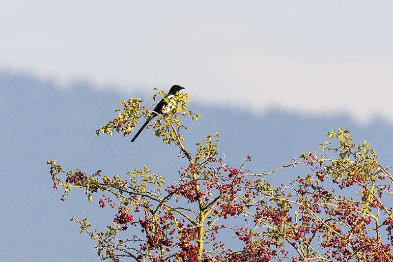 J'y ai installé une mangeoire à oiseaux et pendant une séance de prises de vue des oiseaux, j'ai aperçu un Pic mar au haut des arbres.