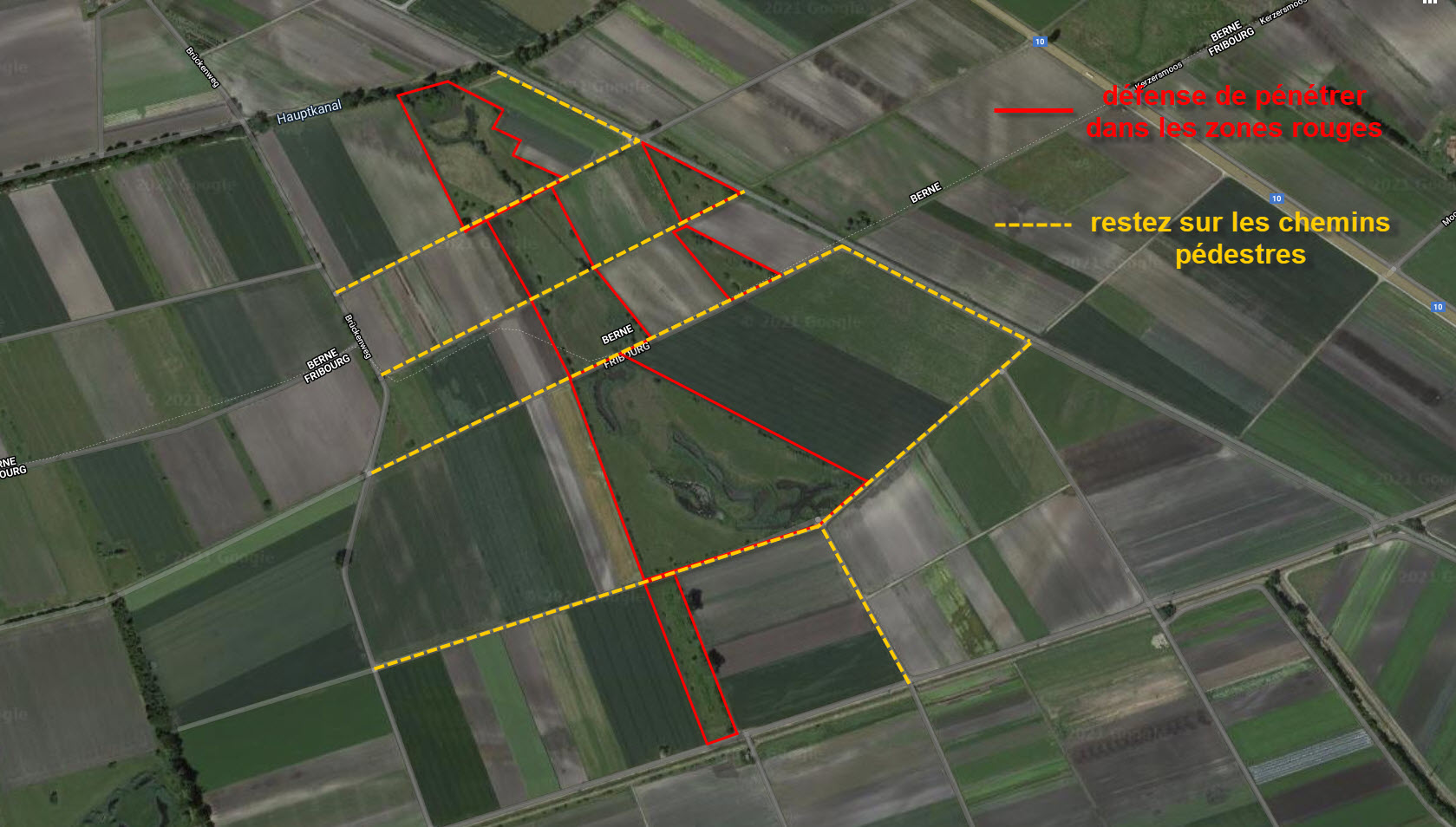 ATTENTION : il est défendu de pénétrer dans la réserve et dans les champs cultivés. Il est obligatoire de rester sur les chemins blancs.