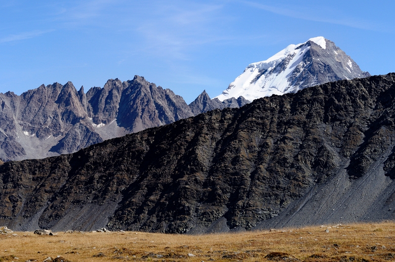 Vue sur le Grand Combin tout de blanc vêtu. Ce dernier contraste avec le noir des roches de la Combe.