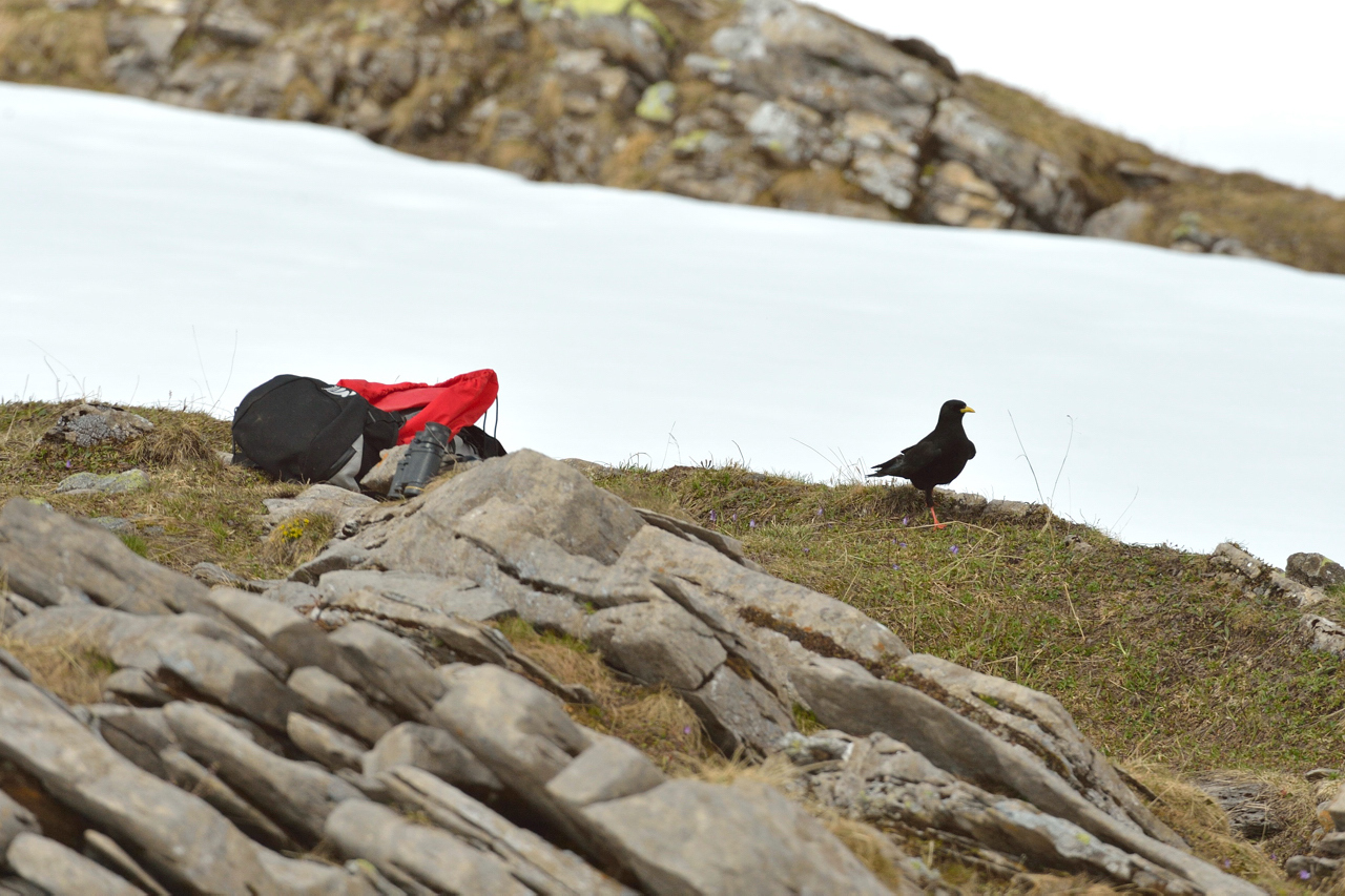 Le Chocard opportuniste tente une approche sur l'un de nos sac.