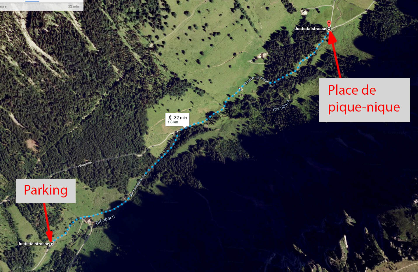 Normalement, nous laissons les voitures là car la route qui monte au Justistal est interdite à la circulation.