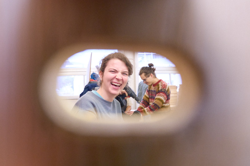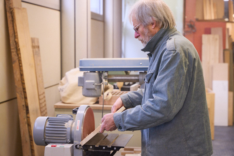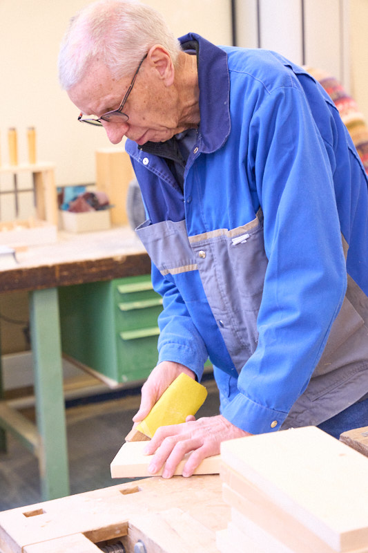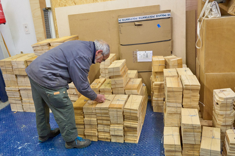 Claude en pleine action d'anglage, ébarbage. Opération importante pour ne pas avoir trop d'échardes lors du montage.