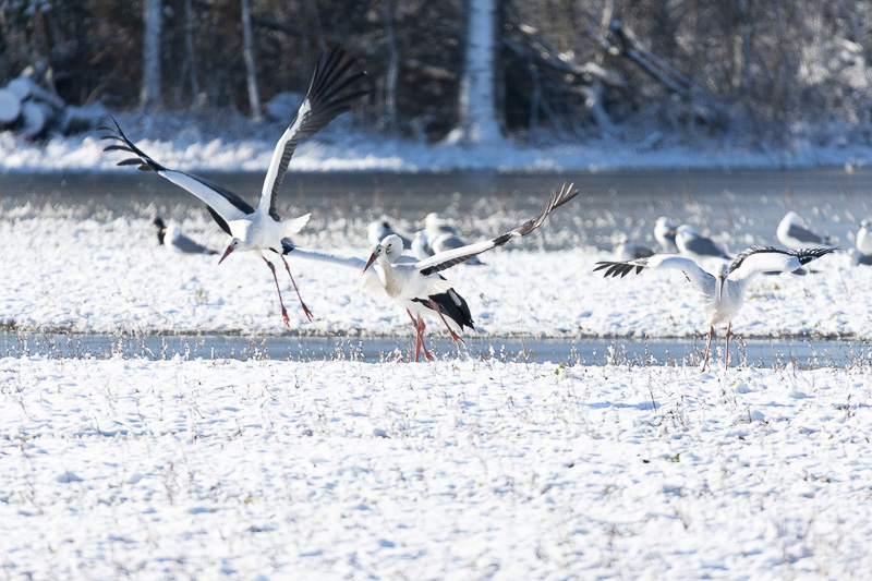 Durant le mois de janvier, j'ai pu observer plusieurs fois des Cigognes blanches dans le Seeland. J'ai réussi à trouver leur dortoir, vers la mi-janvier, j'ai pu en comptabiliser environ 170 individus au dortoir. Ce dortoir était situé vers le terrain de football de Sugiez. Entre 10h et 10h30, les Cigognes partaient en petits groupes de 10 à 20 individus, pouvant aller jusqu'à 40 individus. Ces groupes allaient un peu partout dans les champs du Seeland, pour se nourrir.