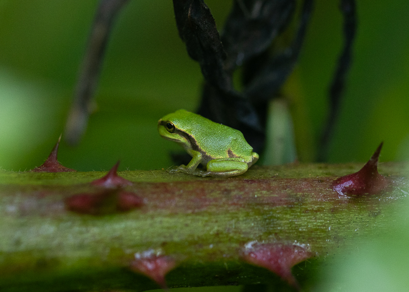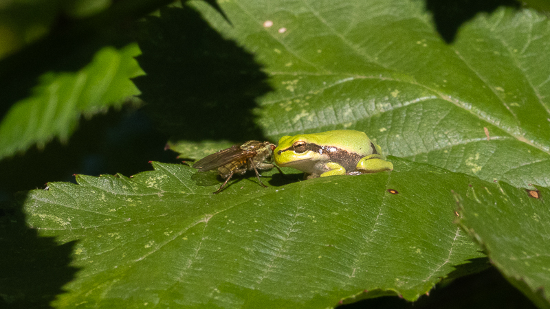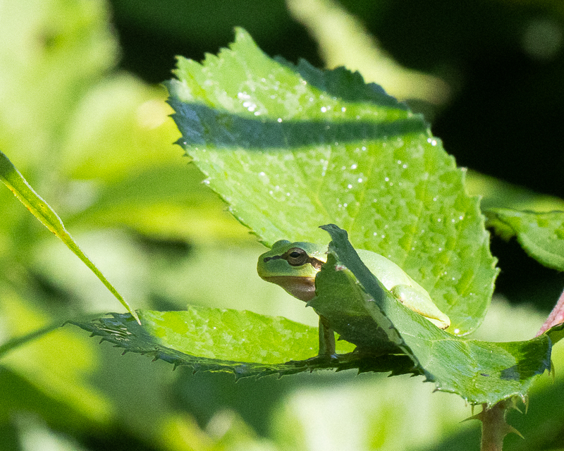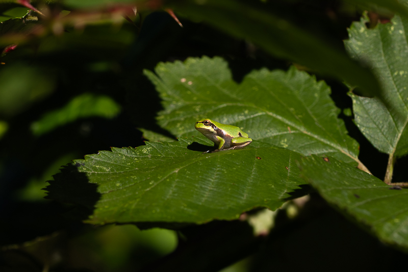 Durant tout mon trajet, j'ai entendu des chants qui n'étaient pas celui d'oiseaux. En cherchant bien, j'ai pu trouver deux Rainettes vertes, mais il devait encore y en avoir cinq ou six de plus, en fonction de leurs chants.