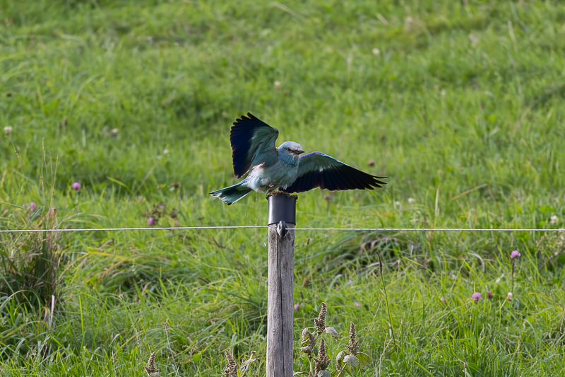 Je me suis rendu sur une colline au sud de Lyss, dans un hameau agricole au doux nom de Bütschwil. Ce hameau est entouré de champs où pâturent des vaches et poussent des vieux arbres fruitiers, de haies et le tout entouré par des forêts. Depuis quelques temps, dans les alentours de ce hameau, un Rollier d'Europe y est signalé. J'ai pu l'observer entrain de chasser des insectes et d'utiliser divers perchoirs tels que piquets, arbres fruitiers, sapins, arbres secs, fils électriques et même des panneaux de signalisation routier.